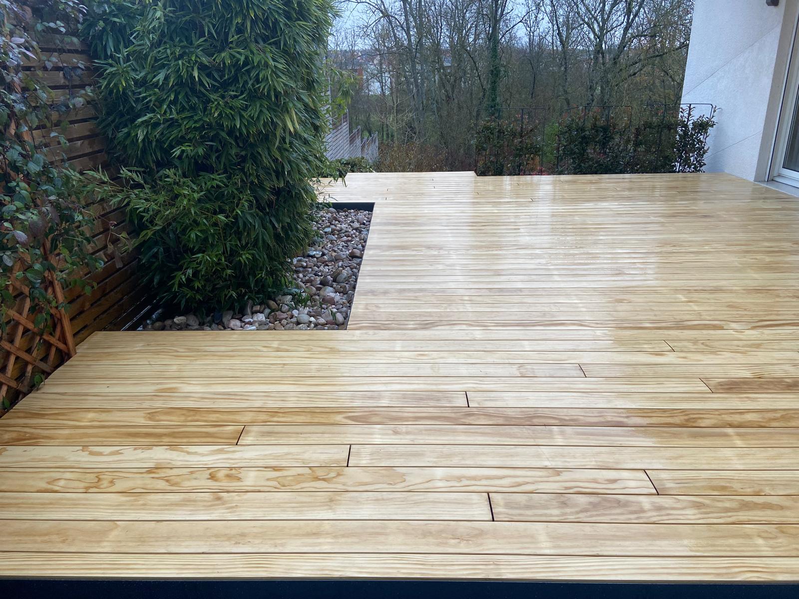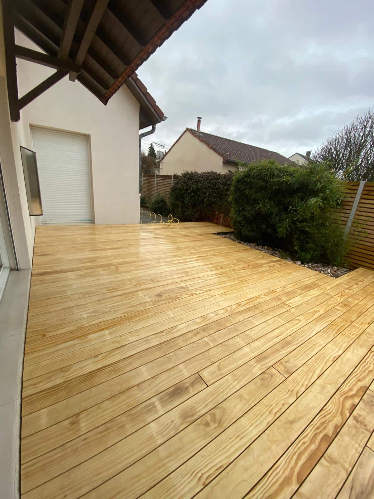 La terrasse peut être en bois, en pierre naturelle, en grès cérame, ou encore en béton, offrant ainsi une grande variété de choix pour répondre à vos besoins et à votre style. Nos clients ont fait le choix du bois pour son côté chaleureux et naturel, qui apporte une touche de rusticité et de charme à leur espace extérieur.